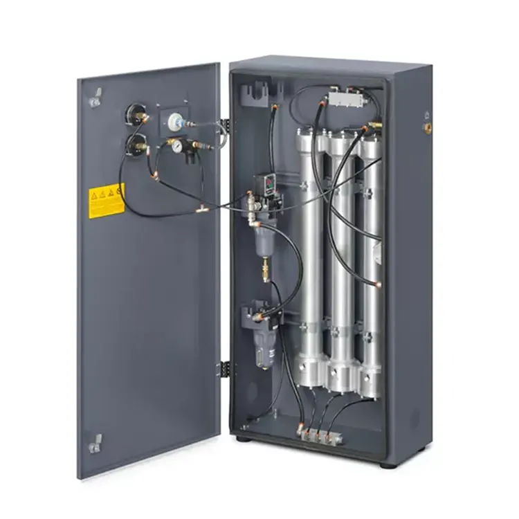 Un generador de nitrógeno integrado de membrana extrae el N₂ del aire suministrado por un compresor para que pueda utilizarse en aplicaciones profesionales. El aire comprimido se empuja a través de una membrana llena de fibras huecas. El oxígeno y el vapor de agua se disipan a través de las paredes de la fibra y se ventilan. Esto deja sólo el nitrógeno muy seco dentro de las fibras, empujado hacia el otro extremo de la membrana, listo para su uso. Somos un fabricante y proveedor profesional de compresores de aire en China. Bienvenido a consultar y comprar.