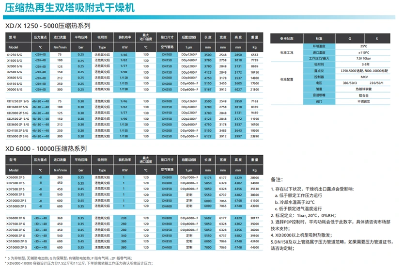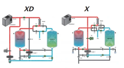 Los secadores de adsorción por calor por compresión XD o X utilizan adsorbentes de alta calidad y utilizan eficientemente el calor de compresión del compresor sin aceite para regenerar el adsorbente, lo que reduce significativamente el consumo de energía y los costos de mantenimiento.
