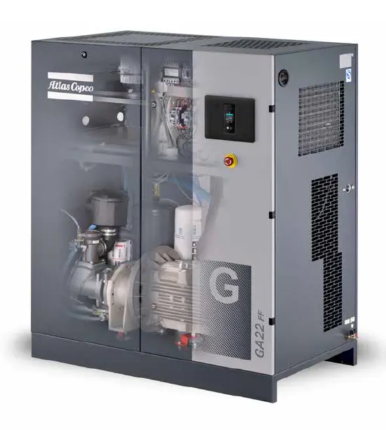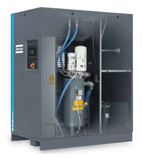 ·El compresor de tornillo con inyección de aceite utiliza el tren de transmisión central y la caja de cambios eficiente de Atlas Copco para una confiabilidad muy alta