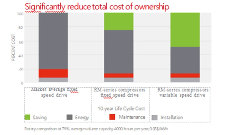 Cada compresor de aire de la serie RM está equipado con una unidad principal nueva y de alta eficiencia, que combina un motor de velocidad fija IE3 y la tecnología de motor de frecuencia variable ECO*-PM VSD IE5, lo que le ayuda a ahorrar hasta un 12-30 % en costos de energía.