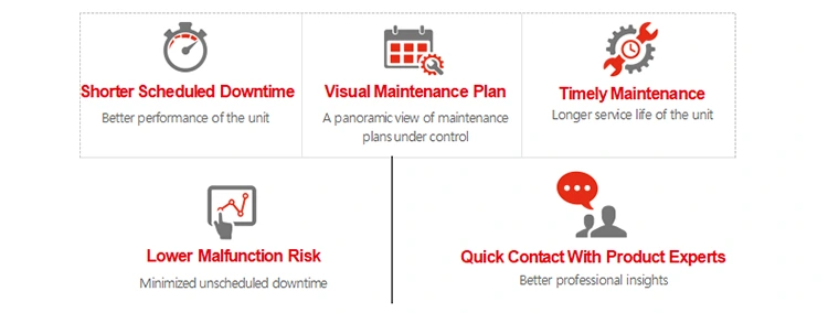 Disfrutará de un diagnóstico preventivo, un análisis del estado actual y un juicio de tendencias; 10 años de garantía para la unidad compresora (para compresores de aire de tornillo rotativo inundados de aceite nuevos)